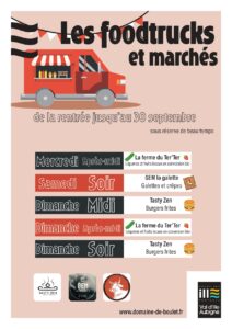 Retrouvez le planning des Food Truck + le marché présent sur le site jusqu’au 30 septembre :